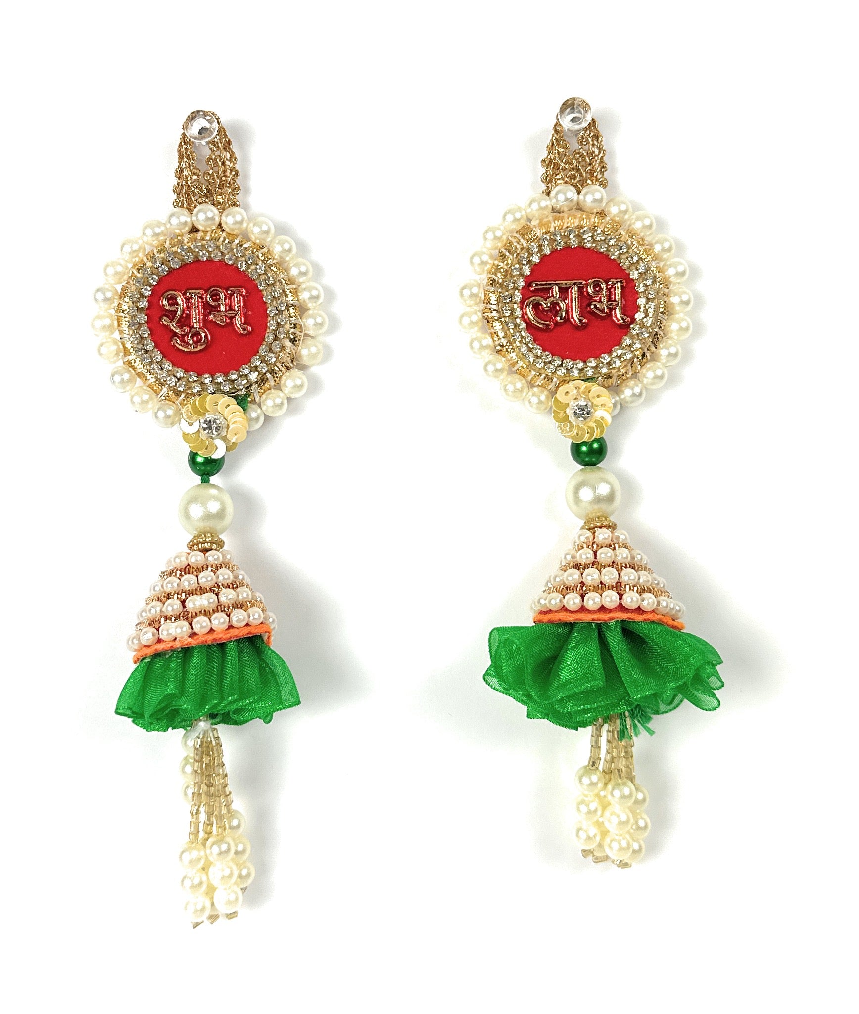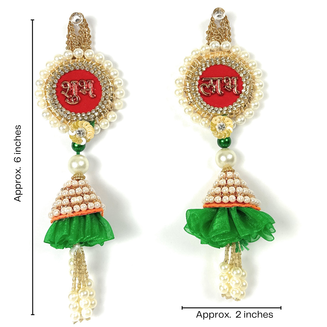 Decorative Shubh-Labh Door Hanging with Pearls and Gemstones, Durable, Diwali Deepawali Decor, Housewarming, Unique Gift (Red and Green)