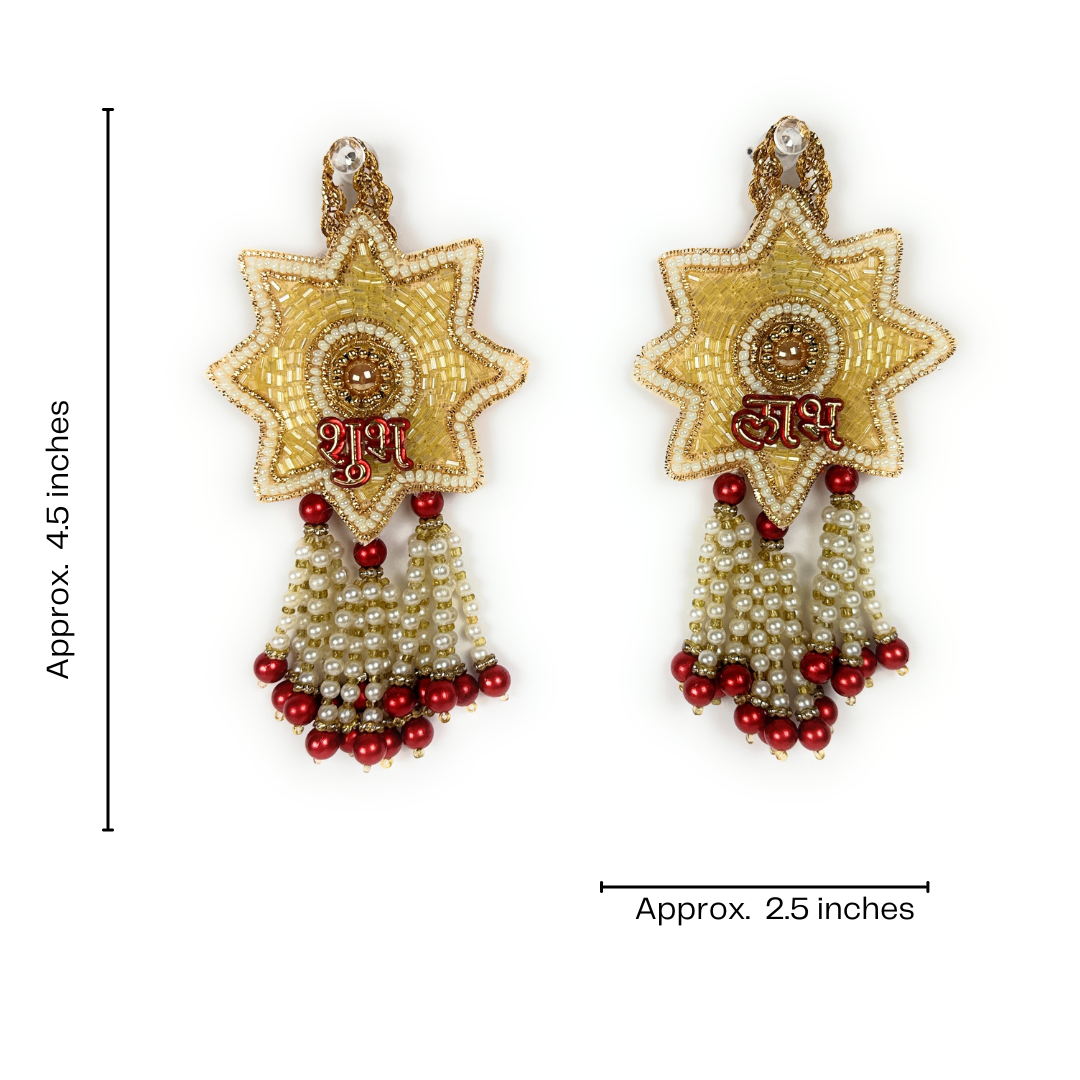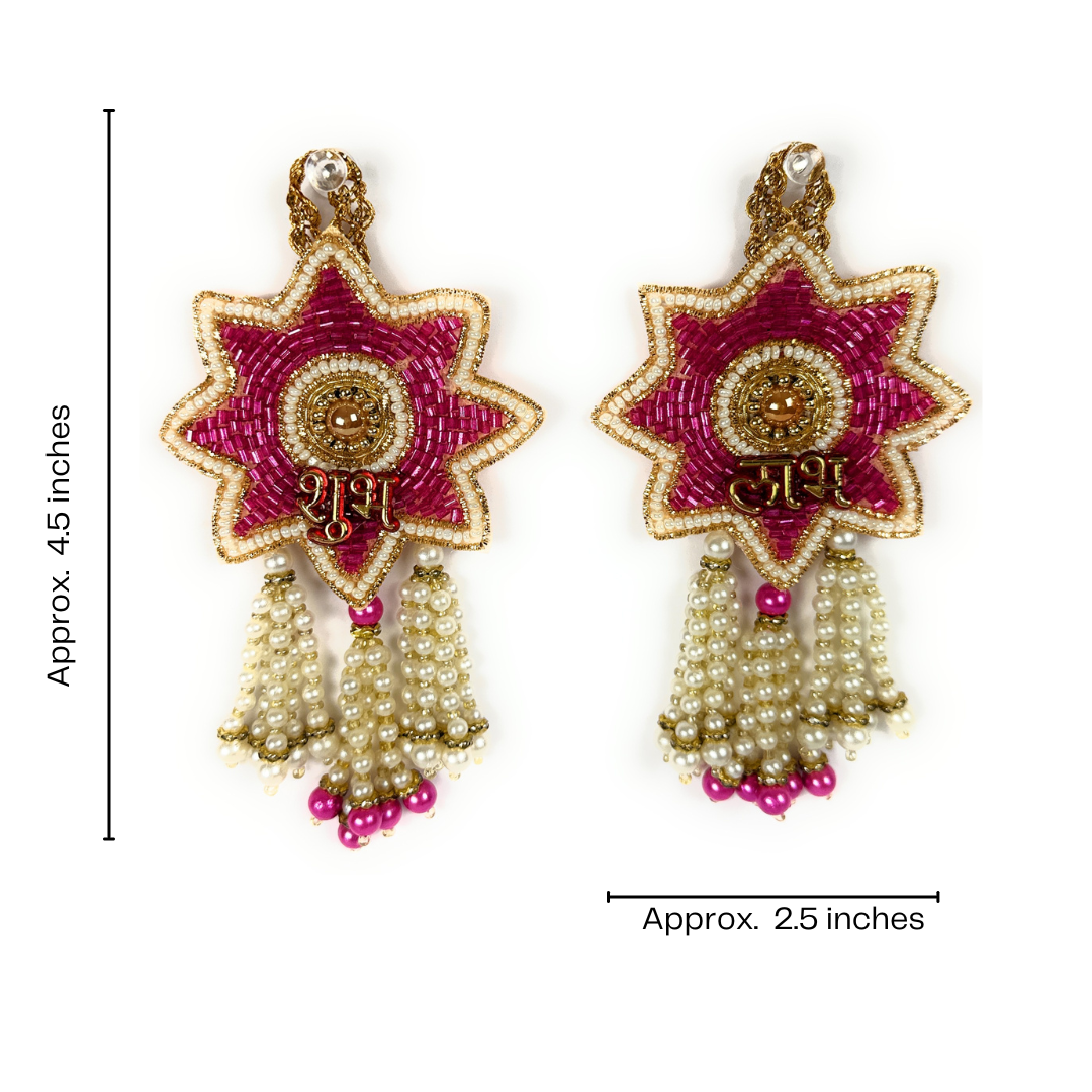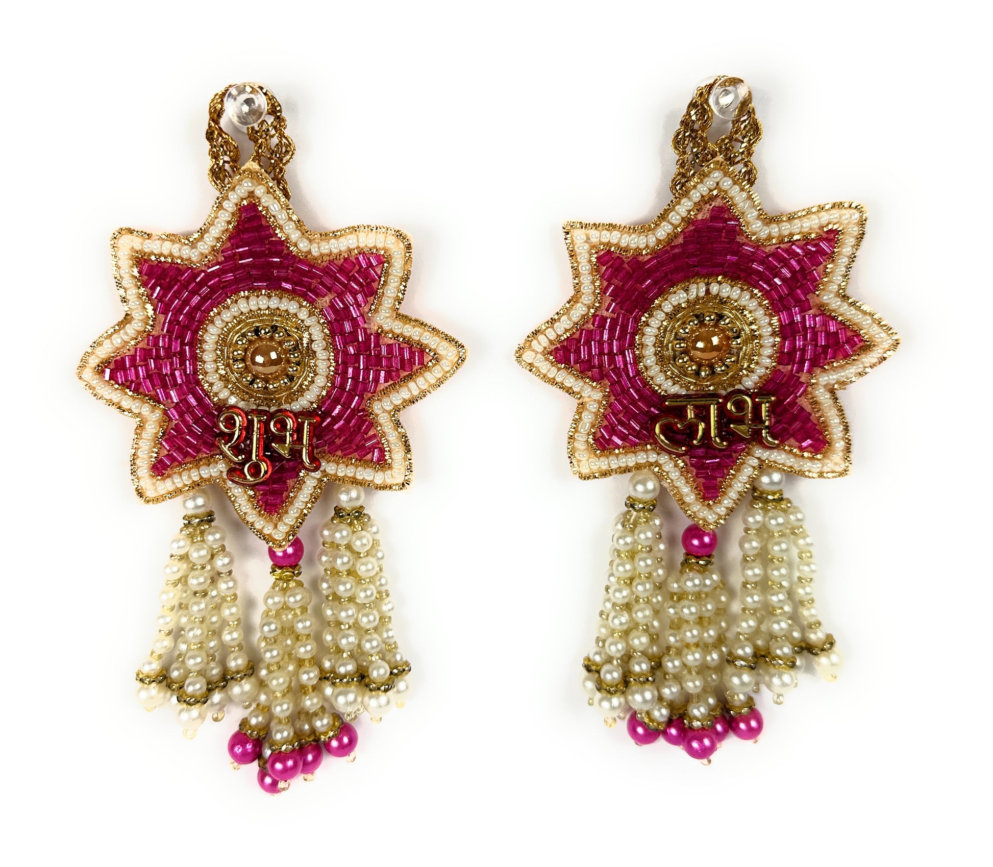 Elevate your home decor with these exquisite handcrafted Indian decorative door hangings, featuring intricate designs adorned with lustrous pearls and vibrant gemstones. Crafted with meticulous attention to detail, these hangings bear the auspicious words 'Shubh-Labh' (meaning good fortune and prosperity) in elegant calligraphy, making them a perfect addition to any festive occasion or housewarming celebration. Durable and reusable, these unique pieces offer a touch of cultural charm and make for thoughtful gifts. Embrace the rich heritage and craftsmanship of India with these captivating door hangings that will undoubtedly elevate the ambiance of your living spaces.
