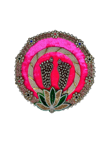 - Handcrafted Elegance: This exquisite piece showcases intricate kundan and pearl embellishments on a vibrant pink Velvet fabric, celebrating the divine Laxmi Mataji's feet in an ornate 4-legged design.