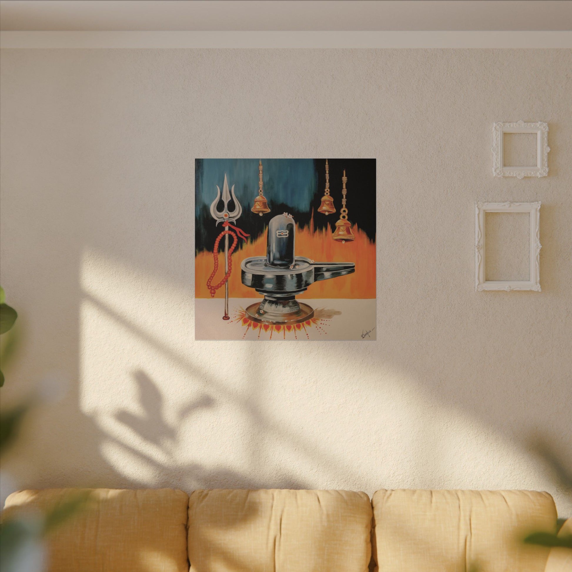 This stretched matte canvas brings a calm, devotional presence to any room. The artwork centers on a polished Shiva linga and trident, set against warm, flickering saffron tones and floating temple bells. Printed with archival latex inks on a durable cotton-poly canvas and finished with a subtle, non-reflective matte coating, the image reads clearly from across a room while keeping an intimate, handmade feel. The slim 0.75" profile and soft rubber dots on the back make hanging secure and simple. It’s a quiet focal point for a meditation corner, prayer alcove, or living space where peaceful ritual and contemplative energy are welcomed.